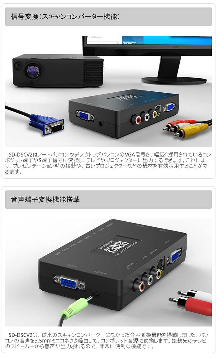 VGA信号をコンポジット/S端子の映像信号に変換 ダウンスキャンコンバータ 【DOWN KING2】 SD-DSCV2 (sddscv2 RCA アダプタ)