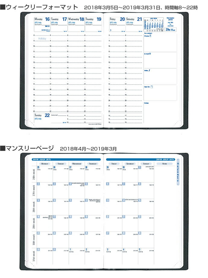 サイズ:10×15cm用紙:ホワイトペーパー時間目盛り:8-22時(日曜は8-19時)月間ダイアリー:2018年4月〜2019年3月週間ダイアリー:2018年3月5日〜2019年3月31日アノプランニング(年間カレンダー):2018/2019年インフォメーションページマップページ別冊横罫ノートクオバディス QUOVADIS HISTORY■クオバディスダイアリーの歴史●1952 フランスの港町マルセイユ。
