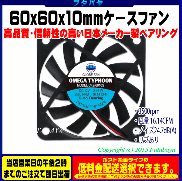 60mmケースファン厚さ10mm薄型:超静音タイプアイネックス(AINEX)CFZ-6010SA●厚さ10mm●60x60x10mm●パルスセンサー付き●リブあり●ケーブル長:29cm●高品質モデル